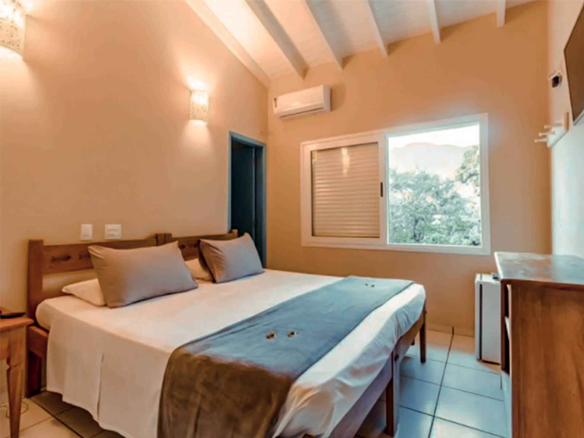 Destaques para a cama king size com colchão de molas, banheiro em cimento queimado com pia de madeira de demolição e varanda privativa. Equipada com TV LCD 32”, ar-condicionado, frigobar, enxoval 100% algodão, manta antialérgica, travesseiros extras e cama extra baixa de solteiro.
