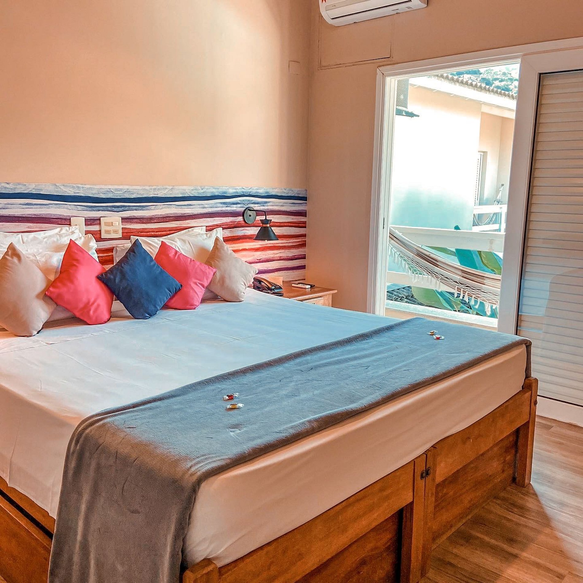 Desfrute do charme e conforto desta suíte no segundo andar, com sacada e rede para relaxar.