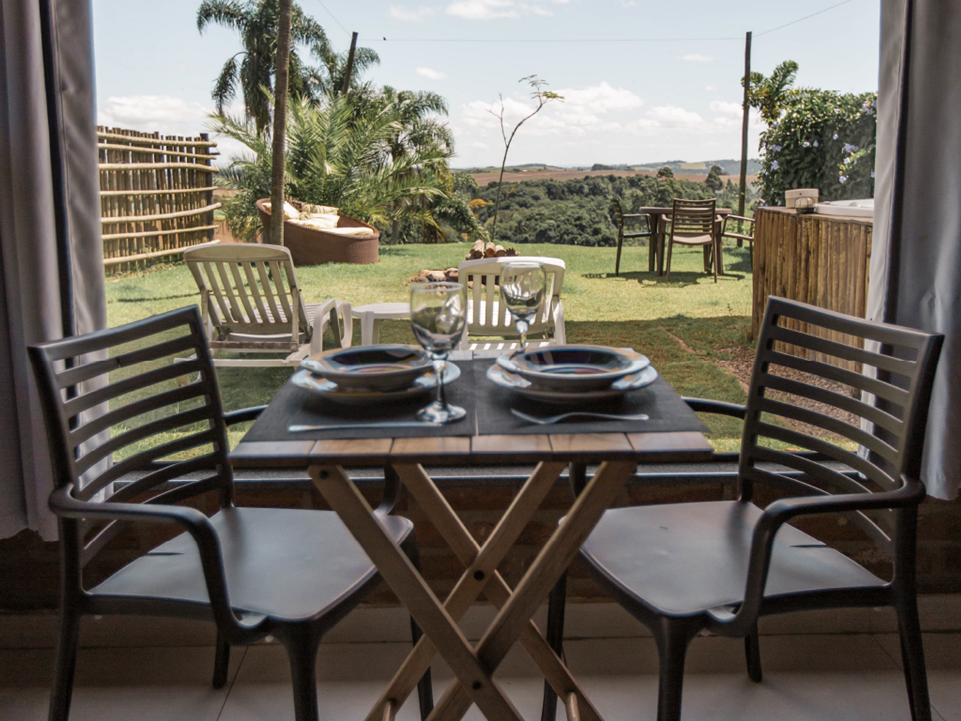 O jardim privativo e a fogueira externa tornam o ambiente ainda mais encantador.