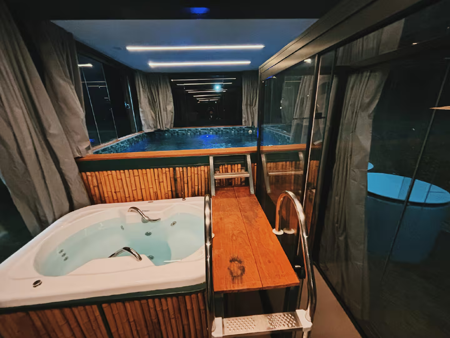 O Chalé 108 oferece piscina e jacuzzi privativas, lareira a lenha e um jardim com fogueira para noites memoráveis sob as estrelas.