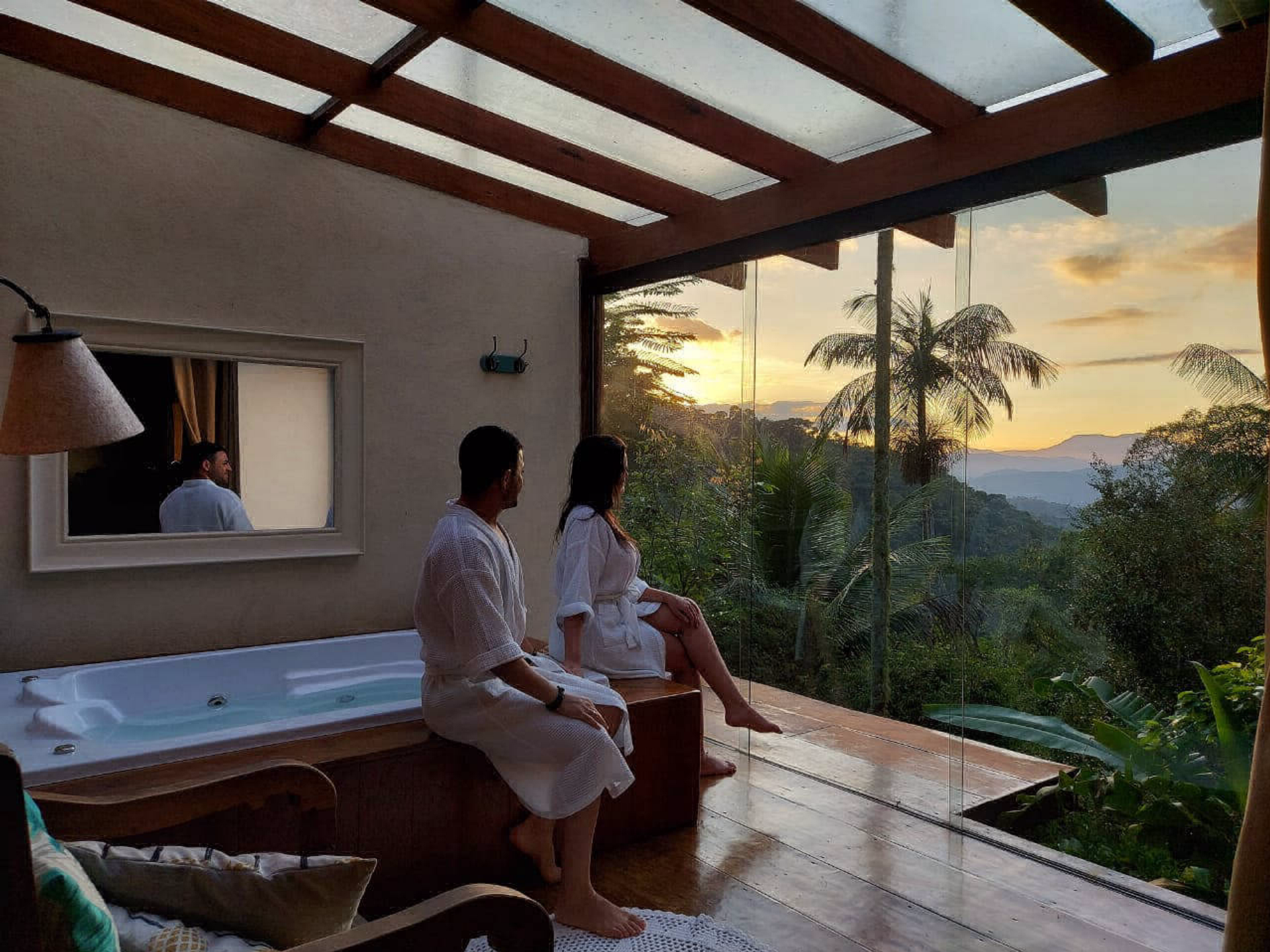 Sinta o equilíbrio entre o conforto e a natureza. Chalé com banheira de hidromassagem e sacada voltada para a Mata Atlântica, ideal para momentos de descanso e conexão.