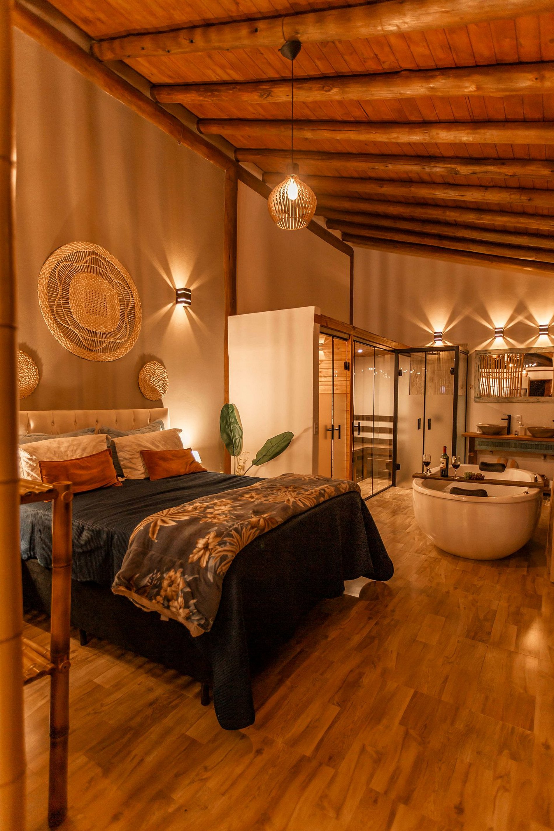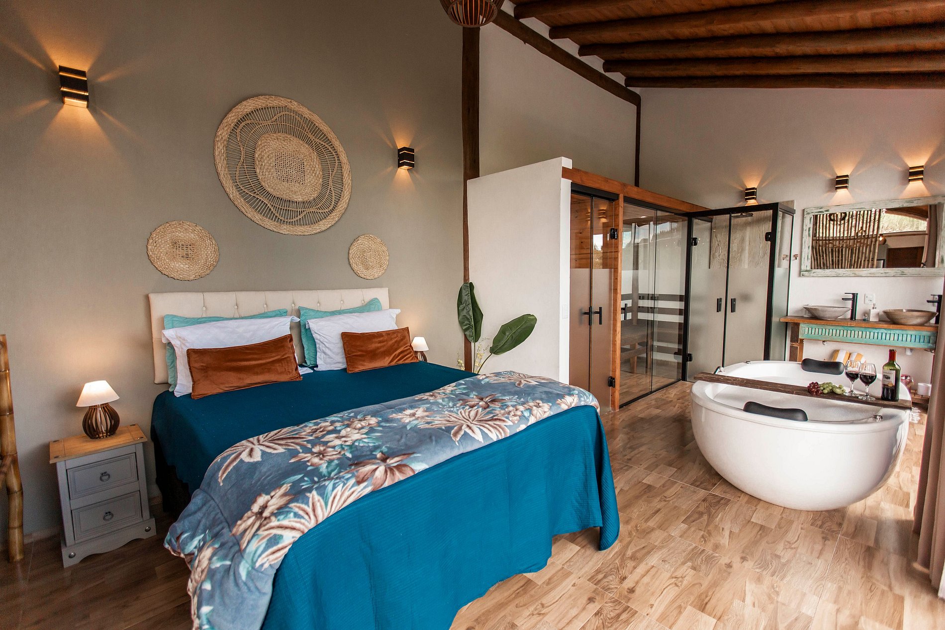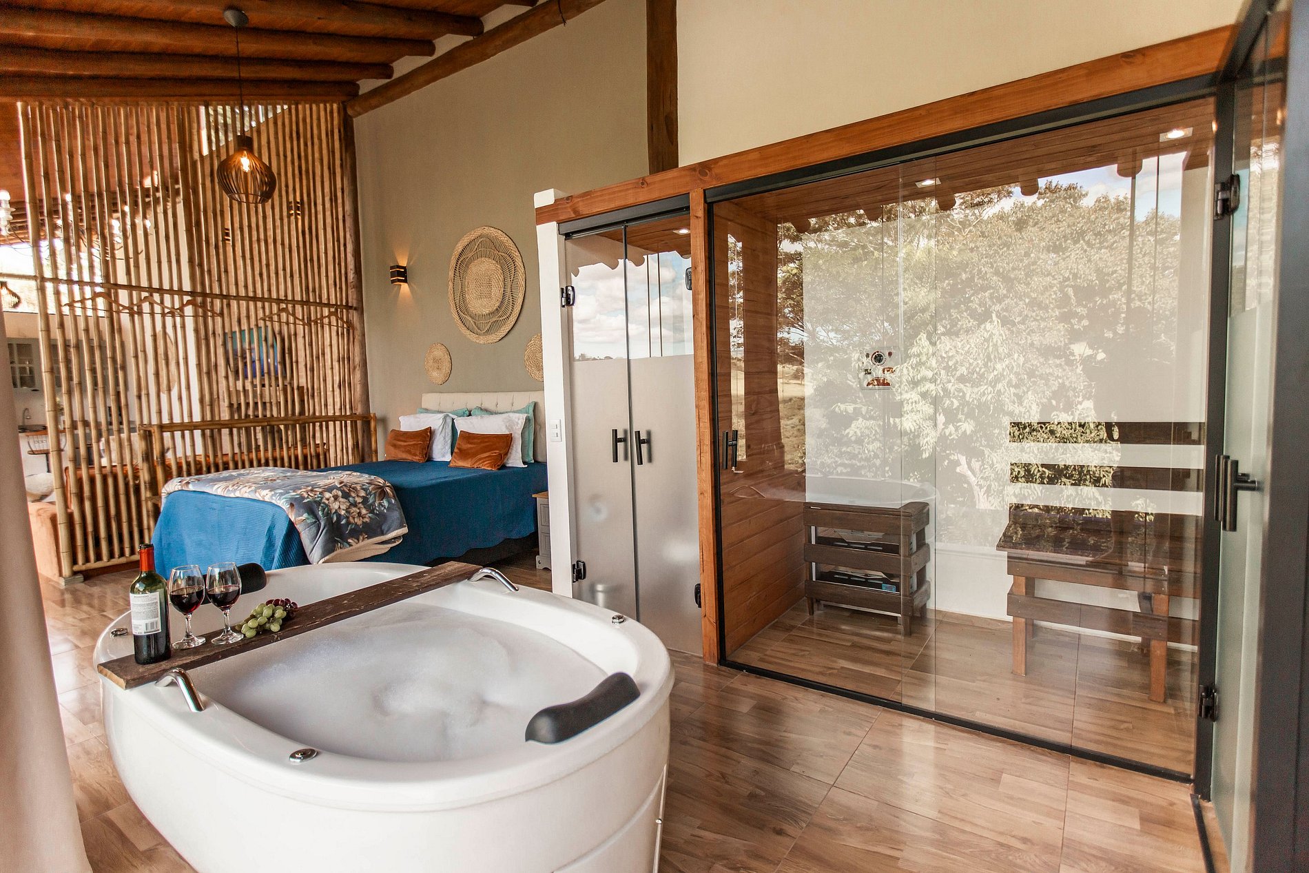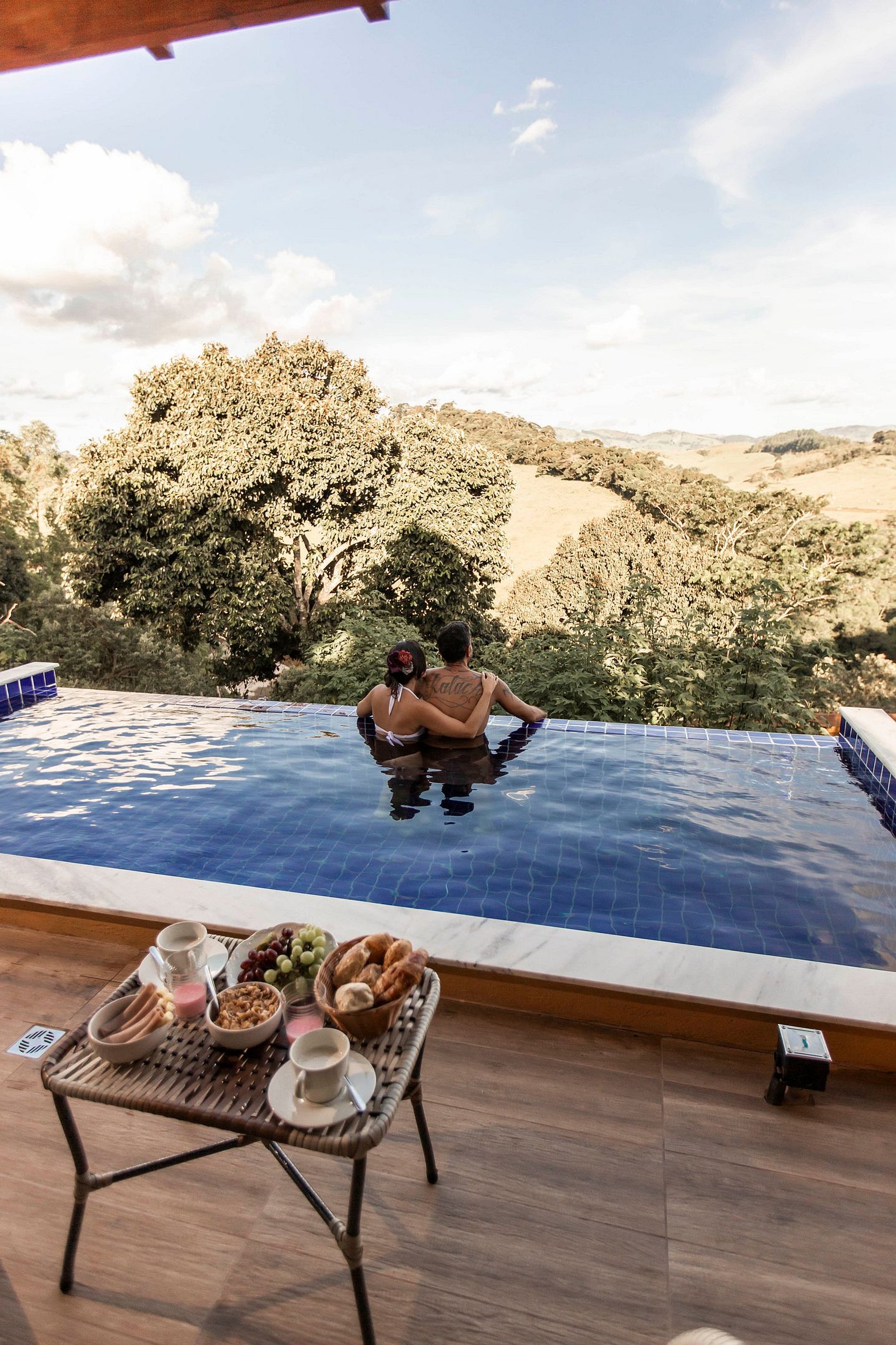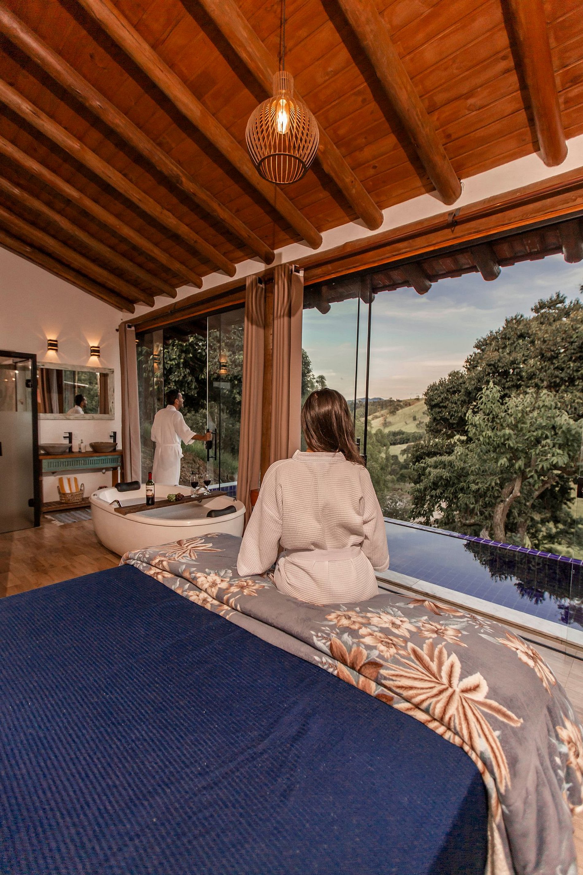 Com piscina de borda infinita e banheira, o Chalé 201 convida você a relaxar dentro d’água enquanto aprecia uma vista deslumbrante das montanhas e da cachoeira.