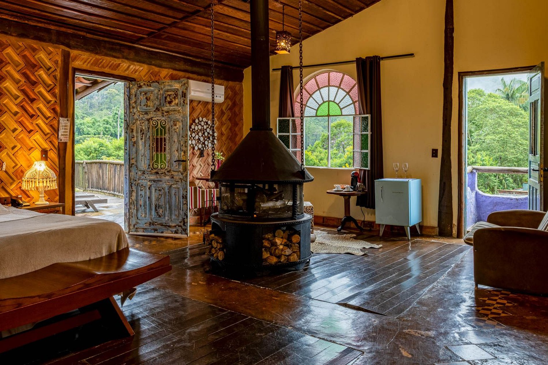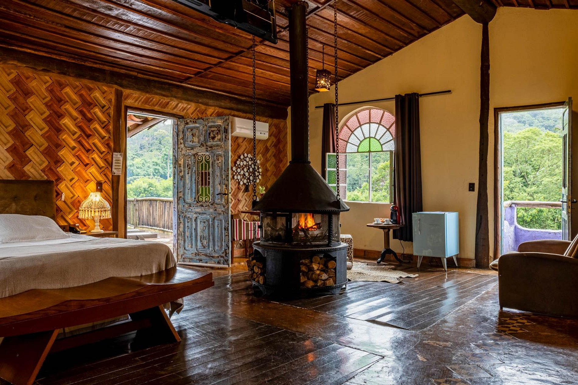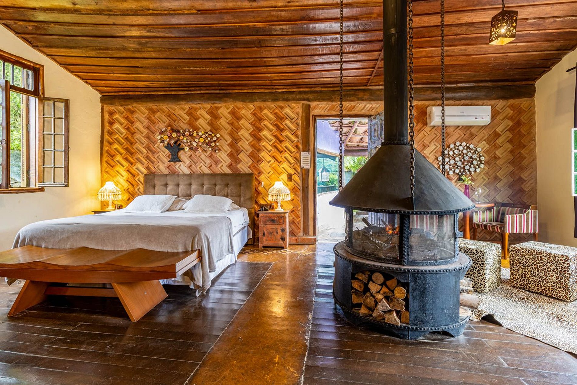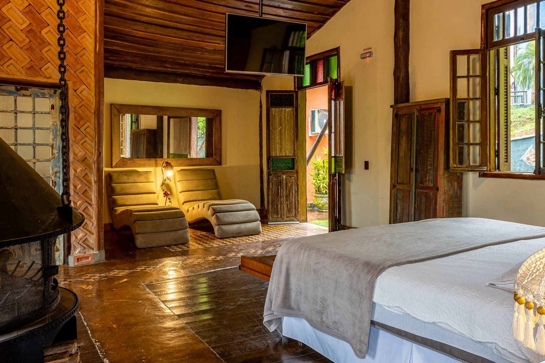Quarto amplo com chaise, ideal para relaxar e aproveitar a vista para a mata e o lago. Acomodação equipada com ofurô, lareira, rede e varanda privativa, oferecendo conforto e contato direto com a natureza.