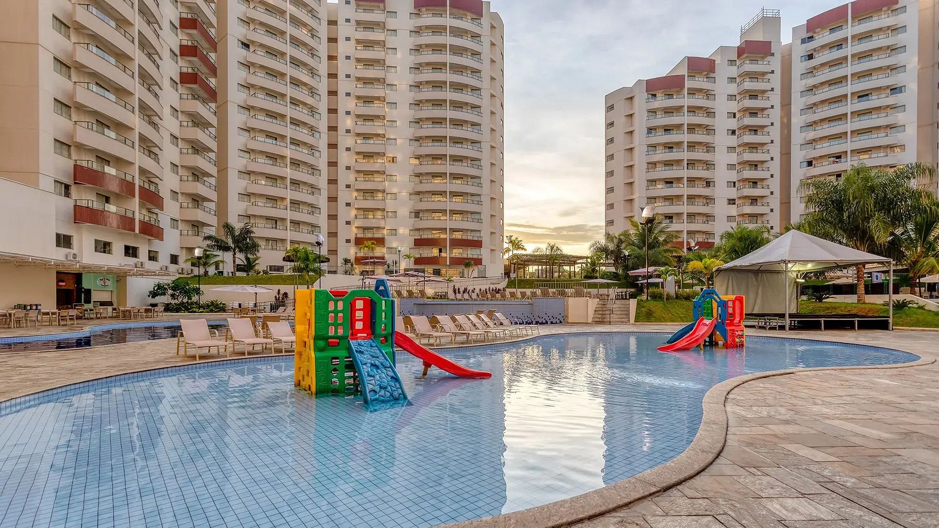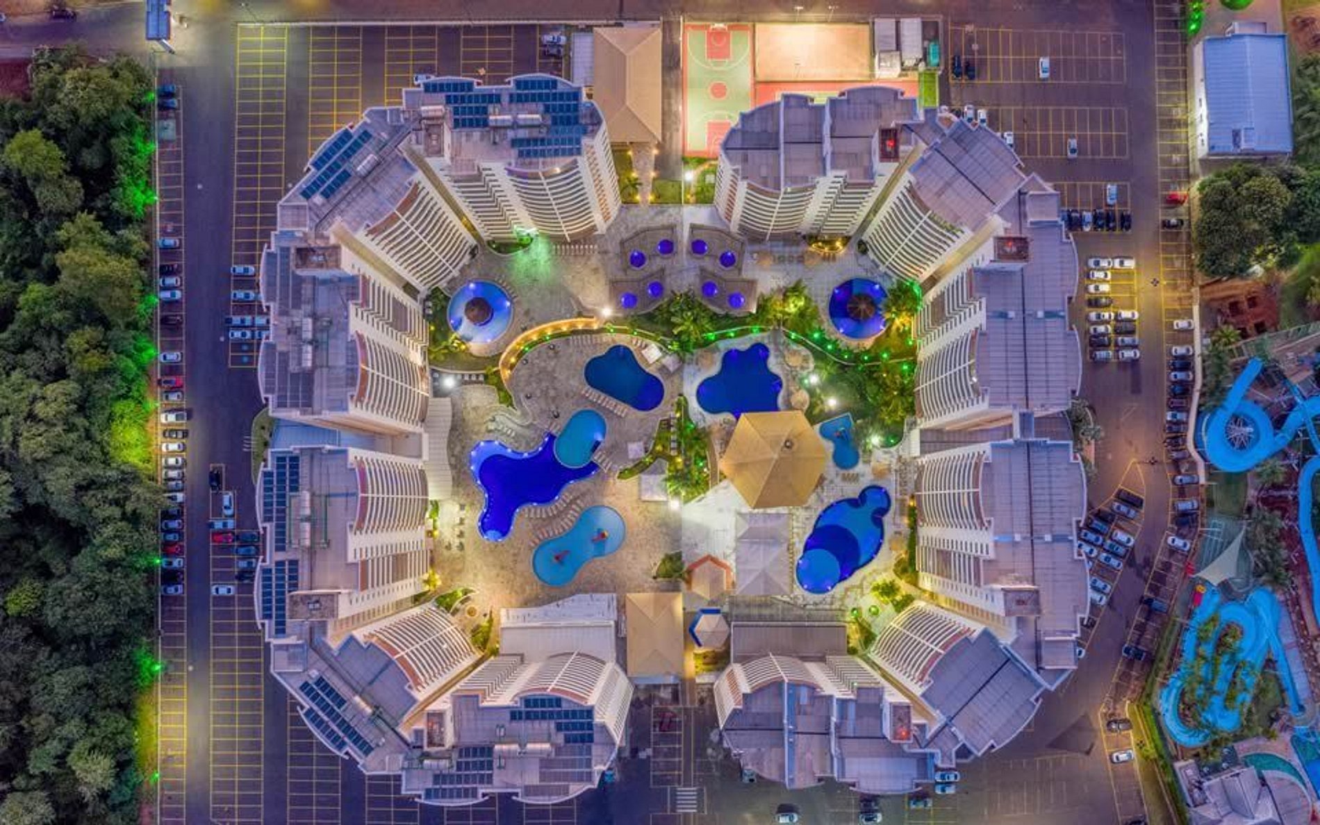 O complexo oferece 11 piscinas climatizadas (sendo 2 cobertas), 8 ofurôs, bar molhado, 2 academias, quadras de areia, tênis e poliesportiva, além de 3 salas de jogos, 2 brinquedotecas, Home Cinema, sala de massagens e SPA (serviço adicional).