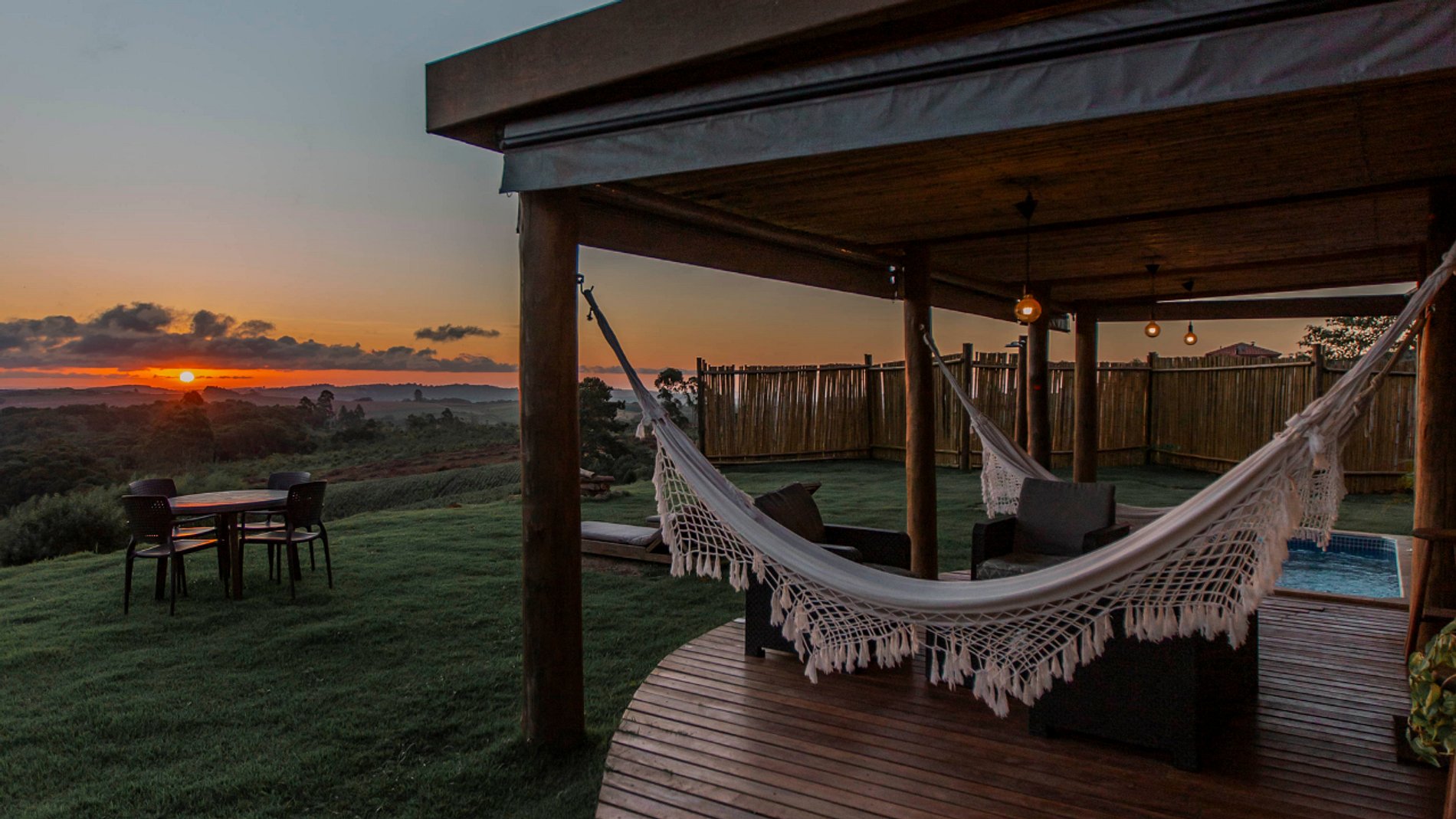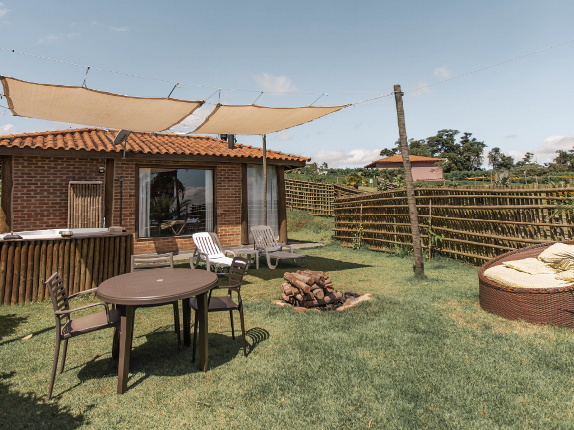 O jardim privativo e a fogueira externa tornam o ambiente ainda mais encantador.