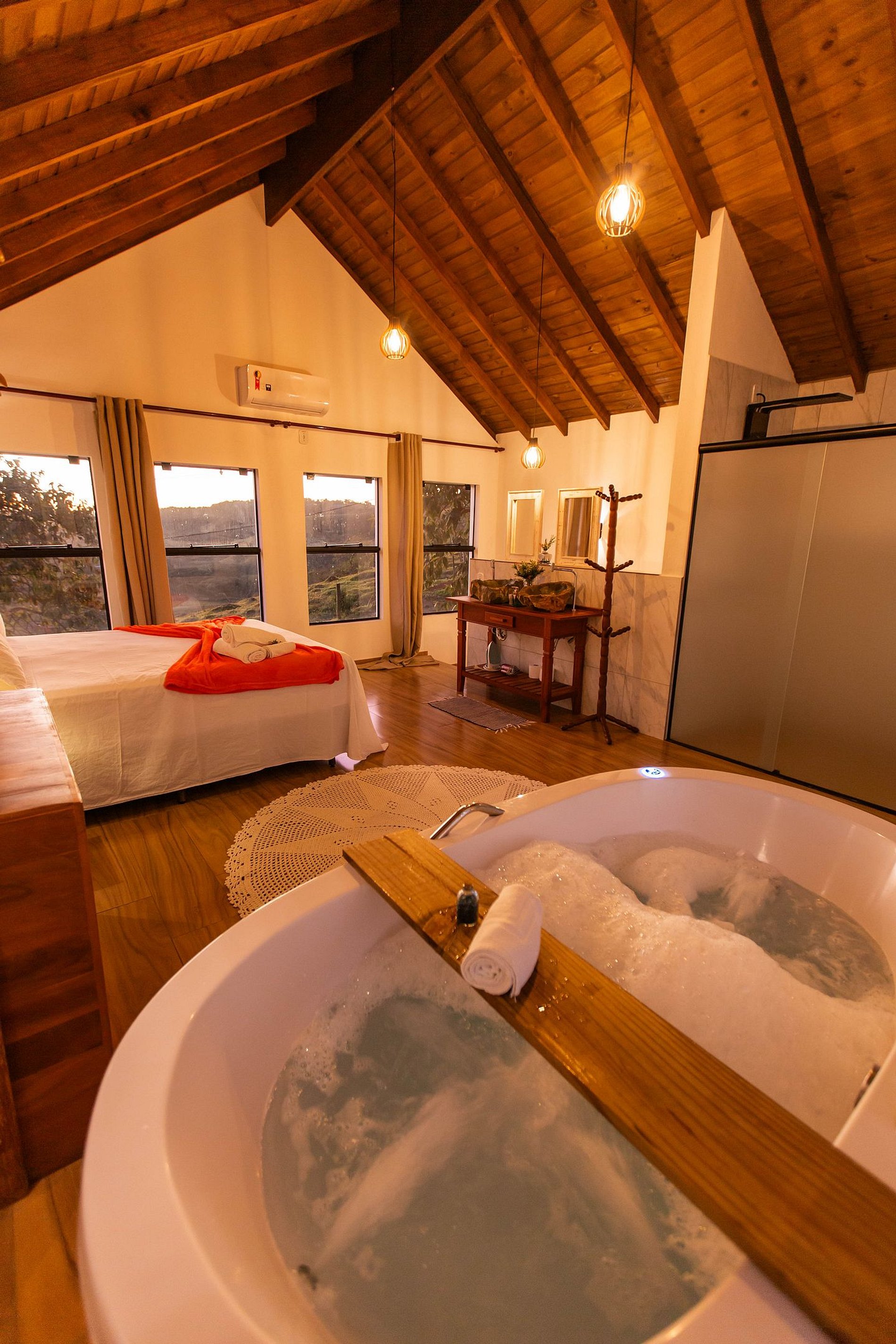 Desfrute de momentos de puro descanso neste chalé exclusivo, com piscina privativa e coberta, banheira de hidromassagem e uma vista deslumbrante para as montanhas. O refúgio perfeito para relaxar e se reconectar com a natureza.